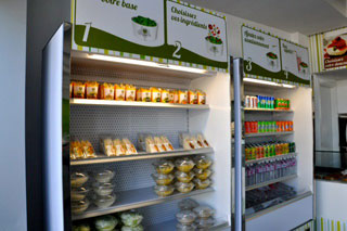 J’ai testé pour vous le Olive Salad Bar, un nouveau café restau concept «salades et sandwichs» pour le déjeuner. Situé au Lac II, dans un ouvrage architectural magnifique, un immeuble gris très particulier au ventre arrondi, le Olive salad bar occupe un bel espace largement vitré, lumineux, et agréable. Pour le concept, clairement c’est du Fresh K «pur jus», même principe, même ambiance et finalement presque même décor : Du blanc, du design inspiré des classes d’enfants ou d’ateliers d’artistes. C’est beau, c’est propre, c’est plus grand, beaucoup plus grand, que Fresh K et donc on y est moins serré. Question carte, les propriétaires ont quand même voulu ajouter une touche «Olive», vous trouverez donc à part les salades, des sandwichs clubs, des wraps, des smoothies, des boissons chaudes, des cheesecakes et des glaces au yoghourt… on est en plein dans la tendance qui cartonne aux USA.