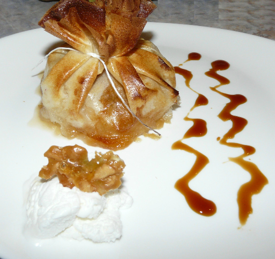 Servir les aumônières avec un filet de caramel par-dessus de chacune.
