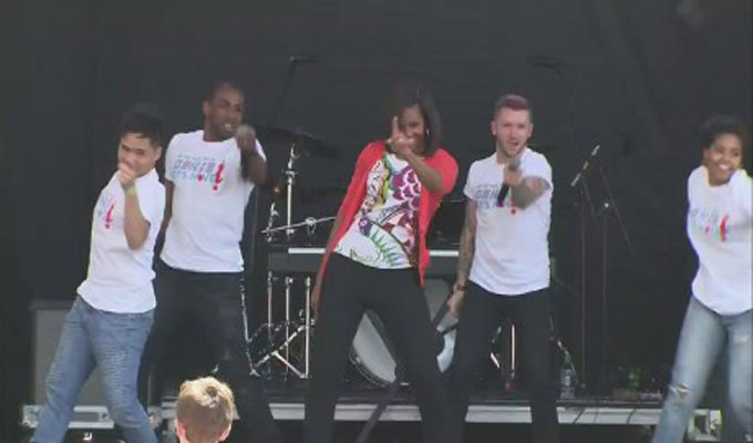 A l’occasion, Michelle rejoint le groupe de danseur en interprétant à la perfection la chorégraphie sur chanson de Mark Ronson « Uptown Funk ». Elle était sur scène pour célébrer, aussi, le cinquième anniversaire de « Let’s Move!« (Bougeons !) sa campagne de sensibilisation des enfants visant à combattre l’obésité infantile.