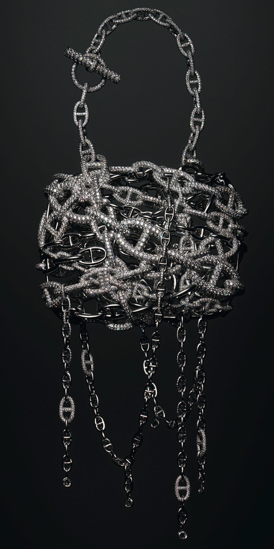 Une autre pièce de la collection Haute Bijouterie Hermès conçu par le talentueux Pierre Hardy. Ce designer de talent notoirement fourni un look unique et l’expérience pour ce sac en particulier. Avec de nombreux clous en or blanc sur l’extérieur et un total de 1.160 diamants, ce qui égale à 33,94 carats, ce sac est hors de l’ordinaire.